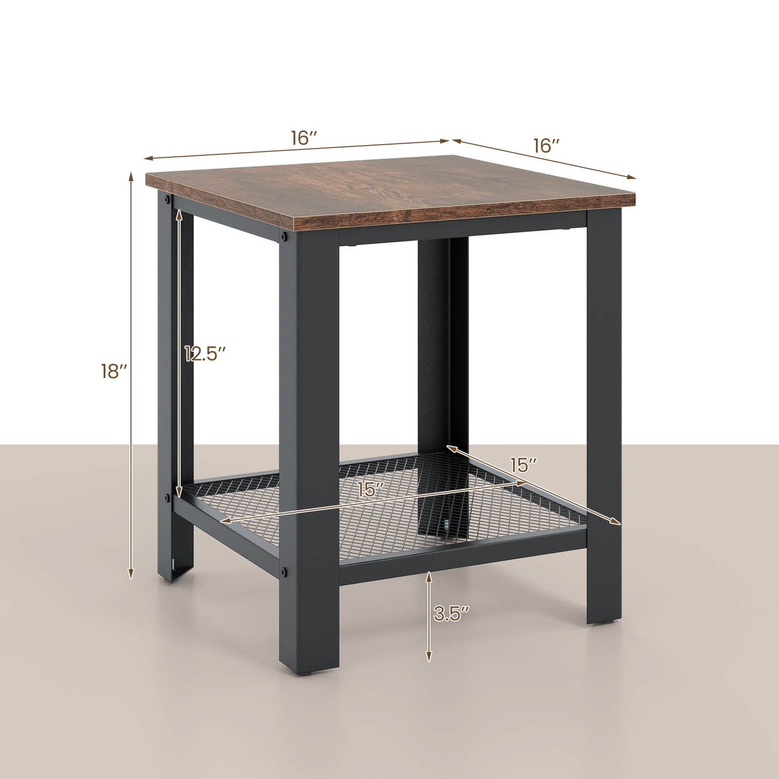 Color: Rustic Brown + Black Material: Engineered Wood, Metal Overall Dimensions: 16" x 16" x 18" (L x W x H) Dimensions of Bottom Shelf: 15" x 15"(L x W) Clearance between 2 Tiers: 12.5" Clearance between Bottom Shelf and Ground: 3.