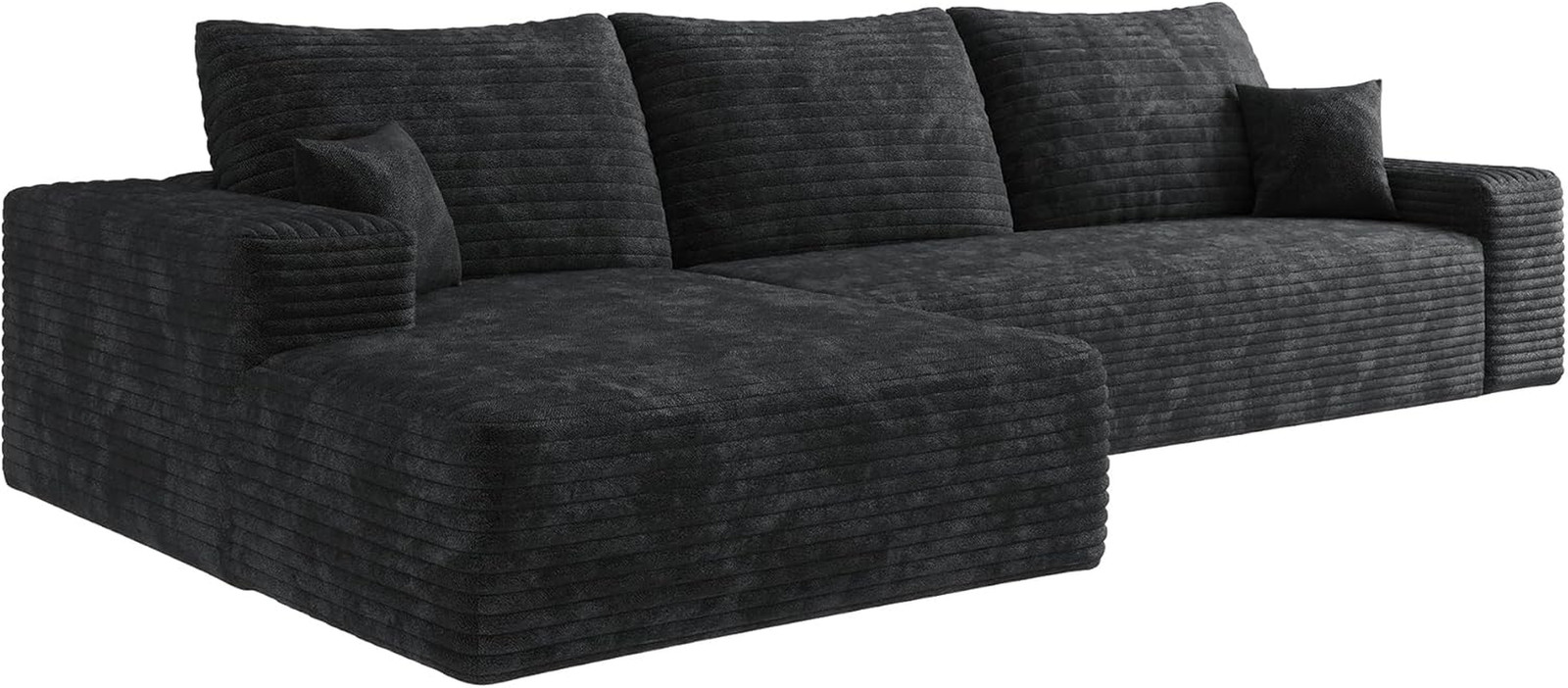 107" Cloud Sectional Couch with L-Shape Chaise,Plush Corduroy Boneless Modular Sofa with Deep Seat,Upholstered Couches for Living Room Bedroom,No Assembly Required,Black(Left Facing). Cushion Construction Foam, Boneless.