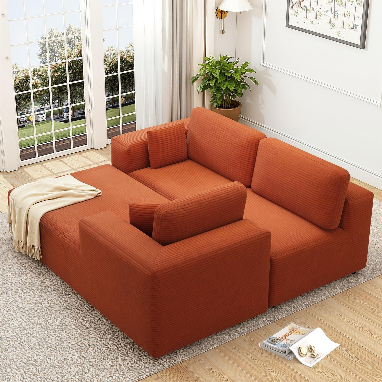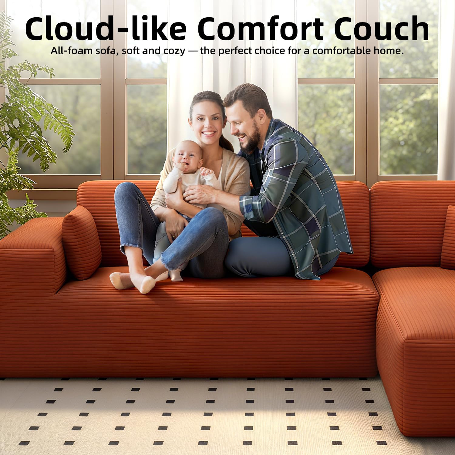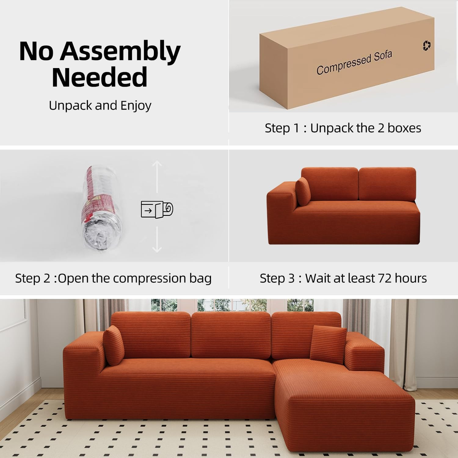 107" Cloud Sectional Couch with Chaise, L Shaped Boneless Couch with Deep Seat, 3 Seater Corduroy Modular Sectional Sofa for Living Room, No Assembly Required, (Right Facing Chaise, Orange). 【No Assembly Required】This oversized boneless sofa doesn't need any tools.