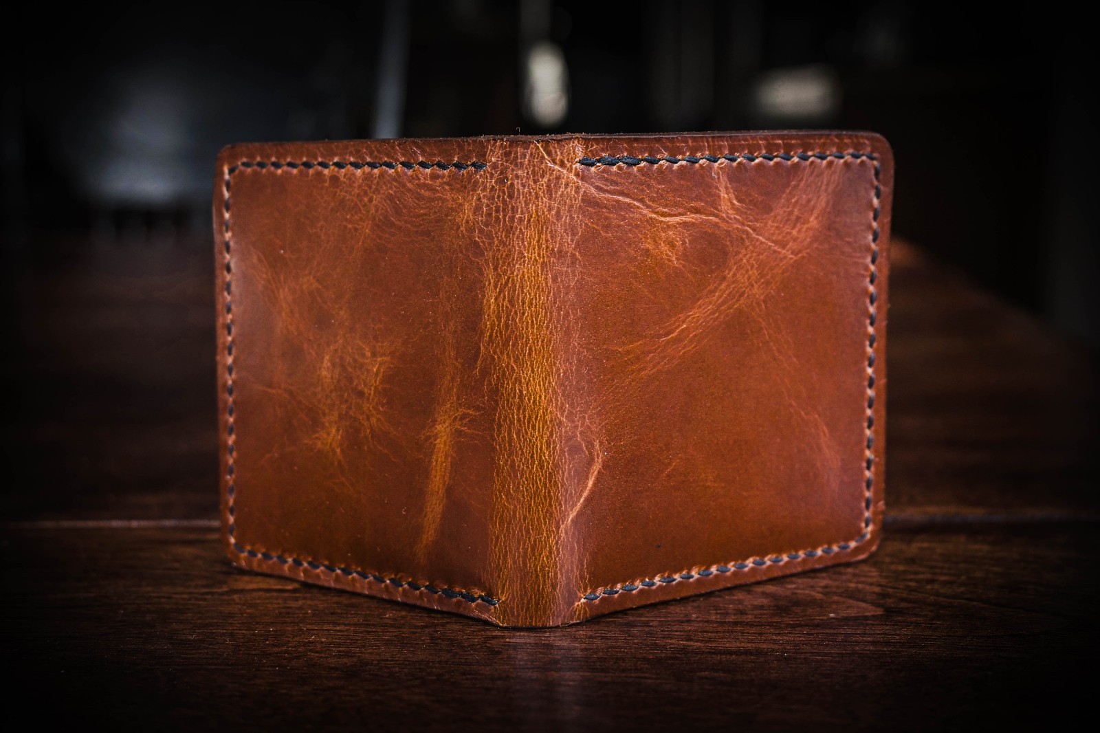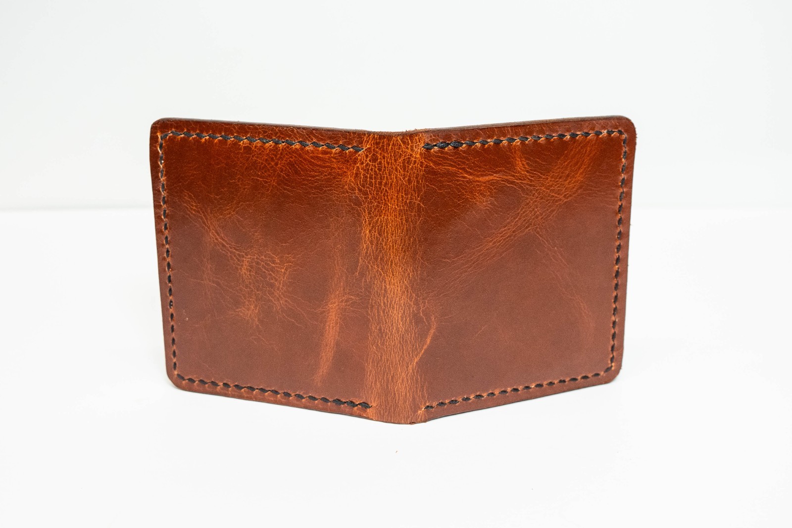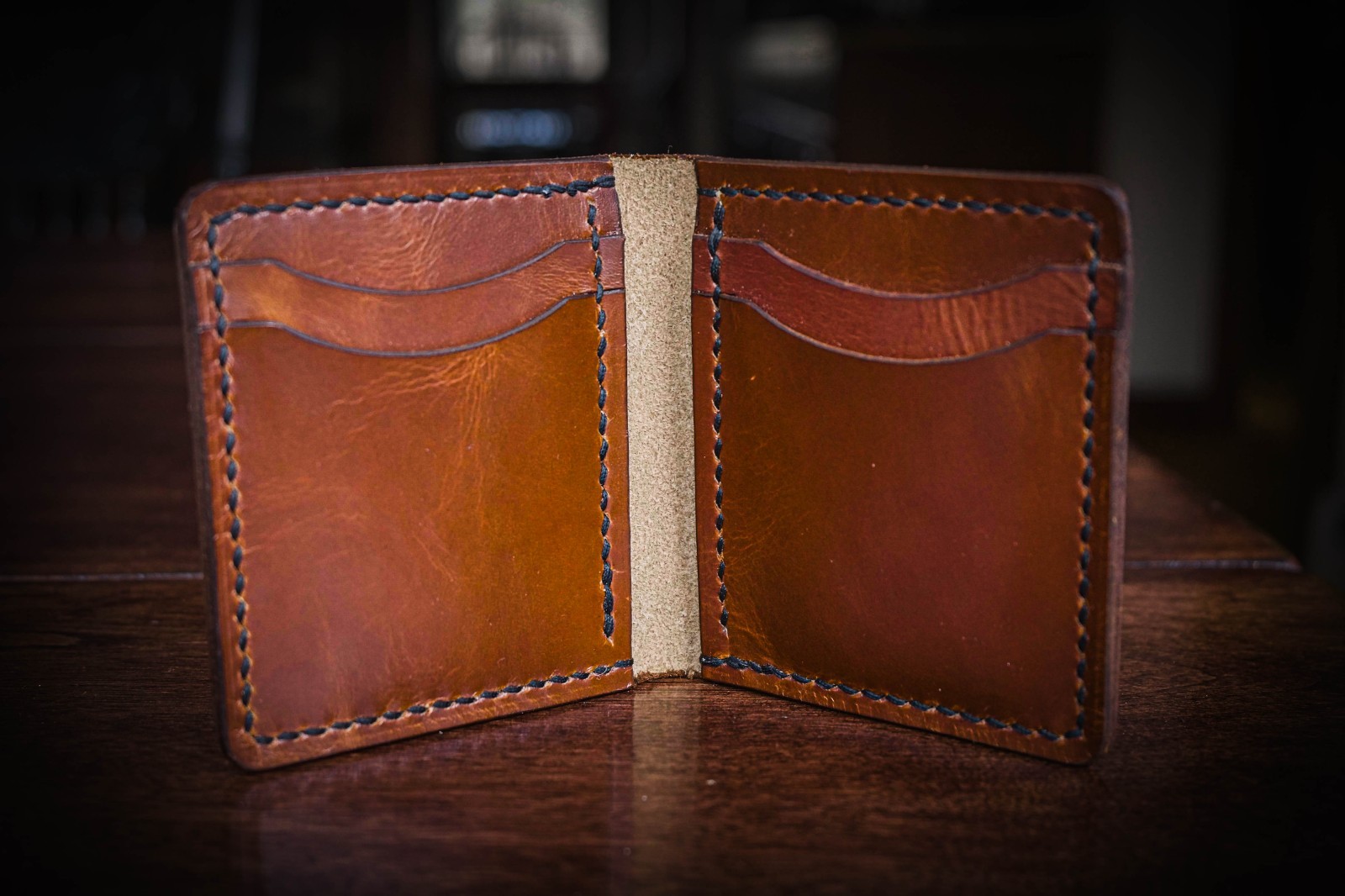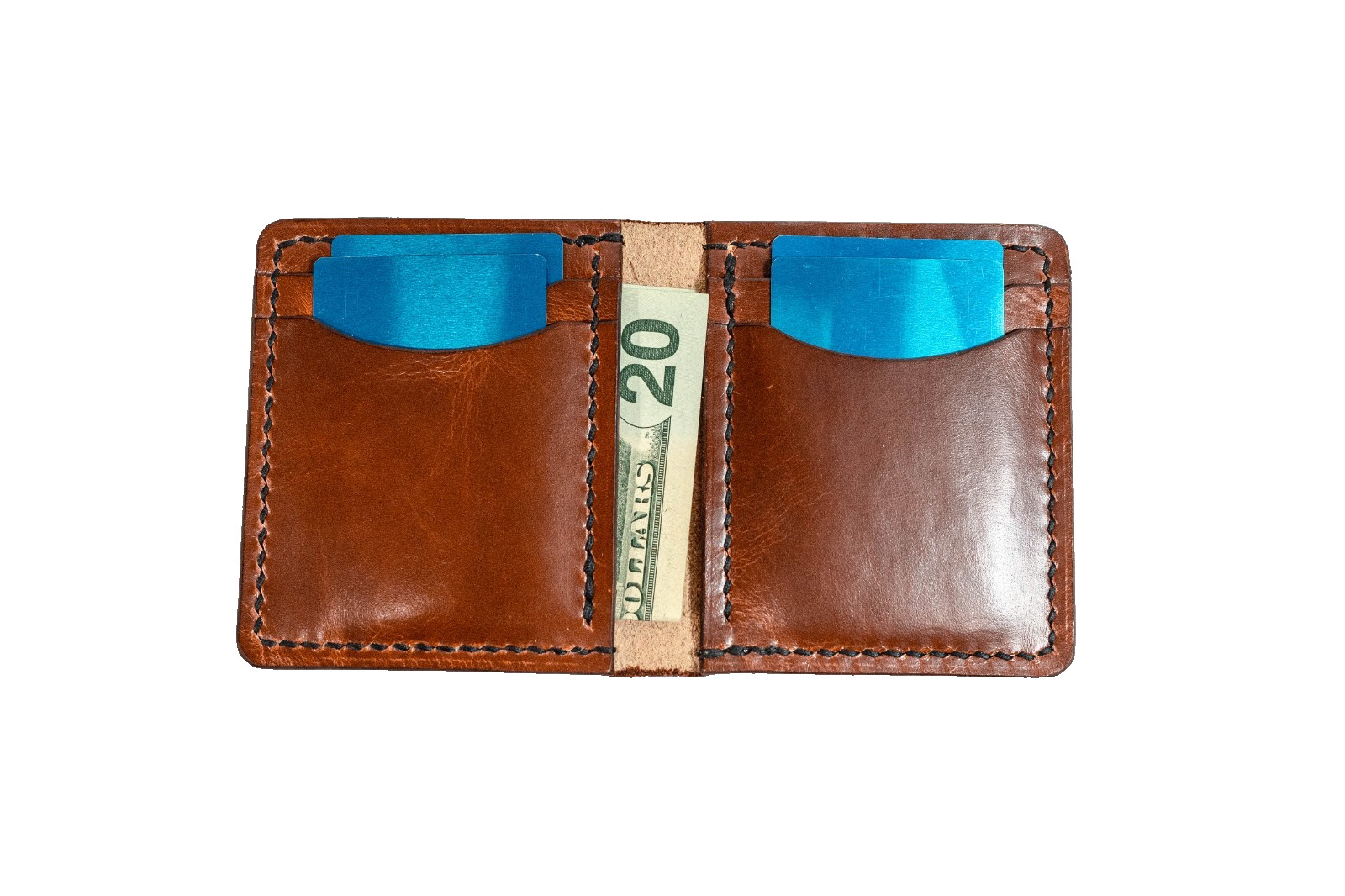This wallet has six pockets, 2 card banks of 2 with hidden pockets behind them. This card wallet is designed to be less bulky than traditionally made bifold wallets while still maintaining the strength and durability of high quality leather.