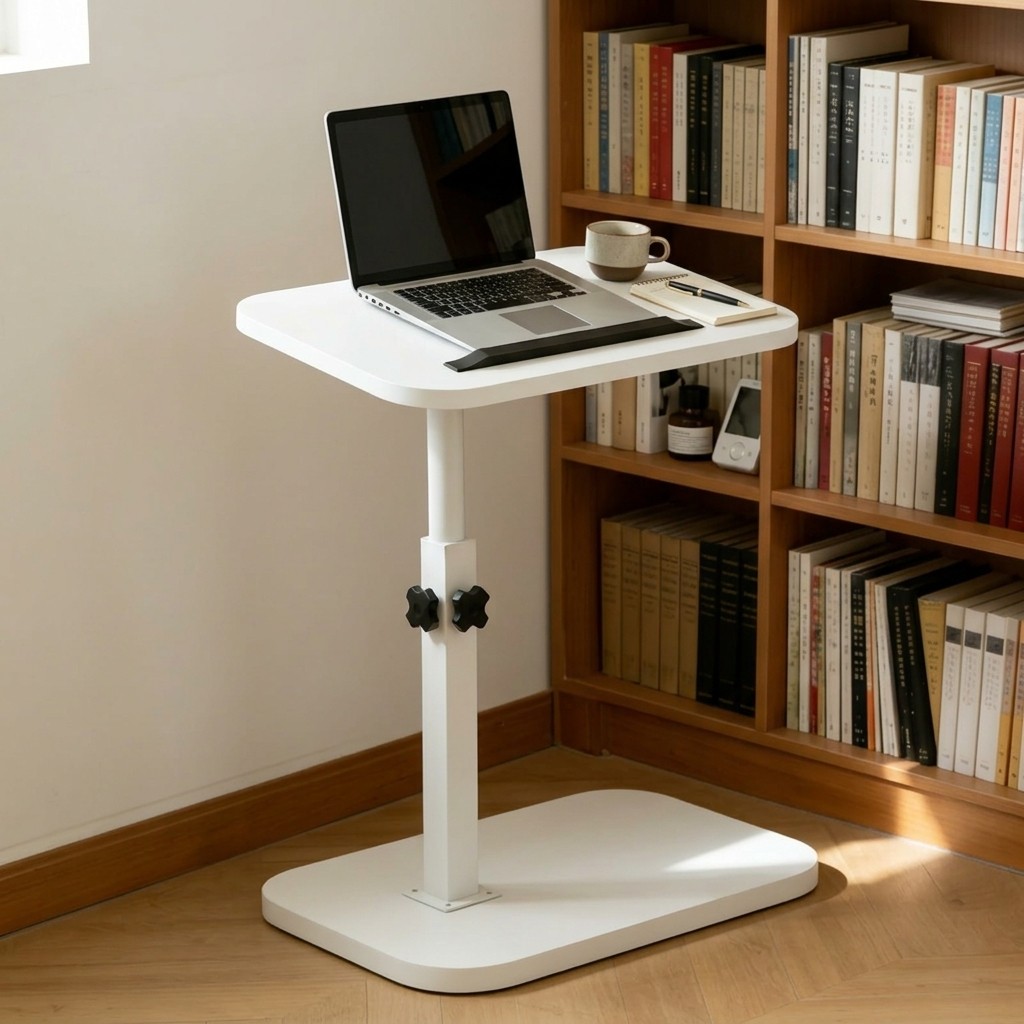 Height Adjustable White C-Shaped Side Table, Swivel Overbed Sofa Side Table