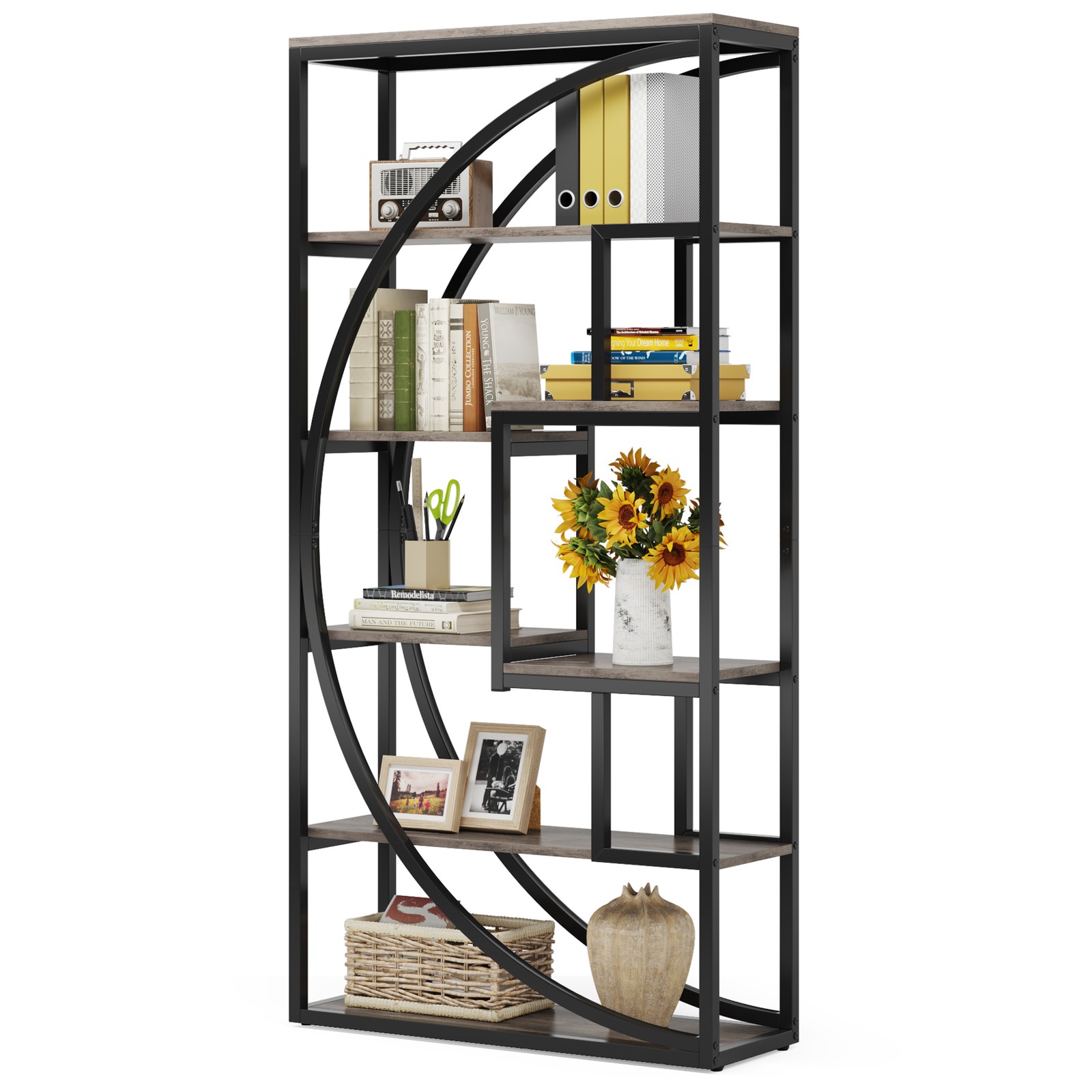 Bookshelf, Industrial 5-Tier Etagere Bookcase, 70.8 Inch Tall Bookshelf with 8 O