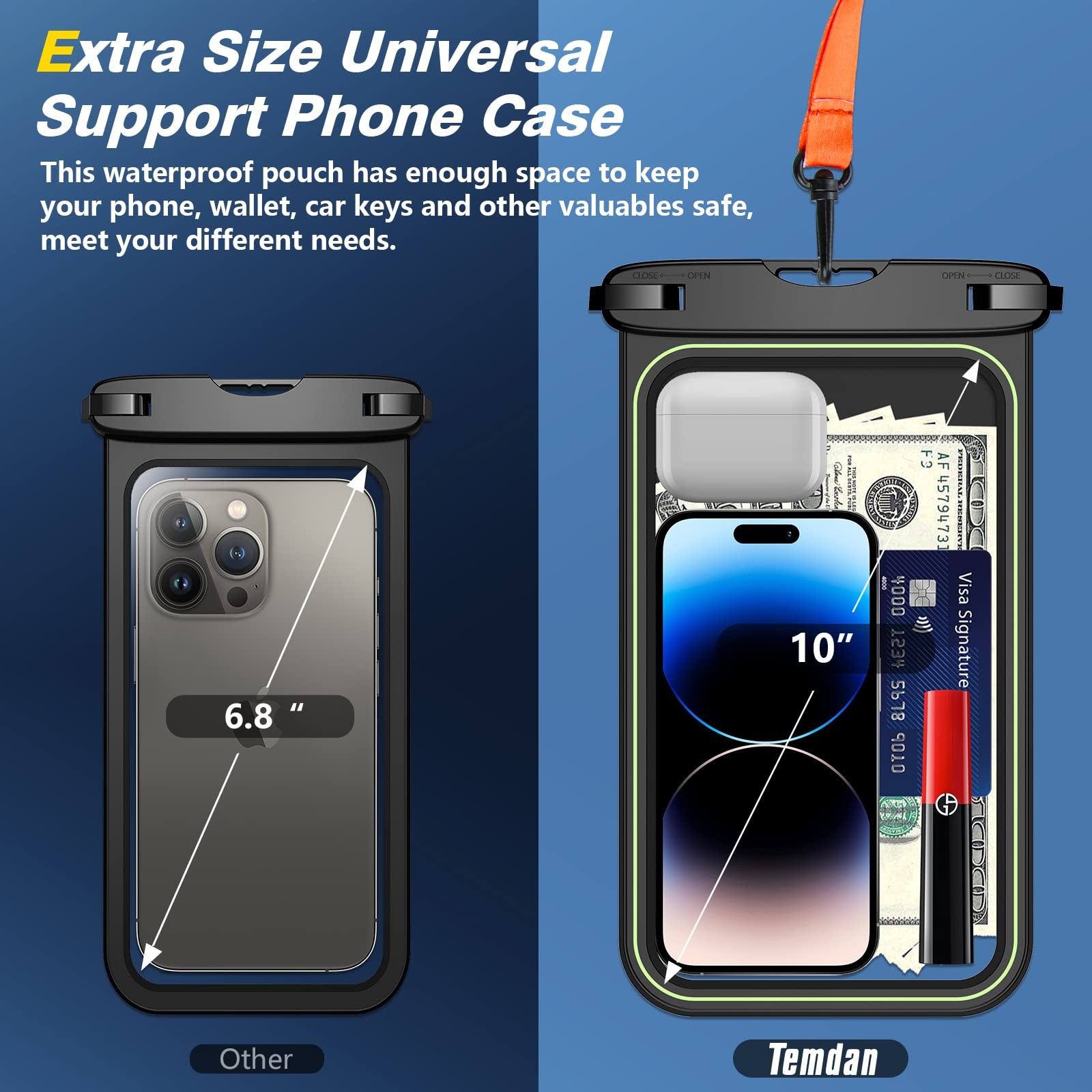 Temdan 2 Pcs Floating Waterproof Phone Pouch,[Up to 10" Large] Universal IPX8 Waterproof Cell Phone Dry Bag with Lanyard for iPhone 16 Pro Max/16E/15/14/13/12/11,Galaxy S25 Ultra/S24/S23 for Vacation.