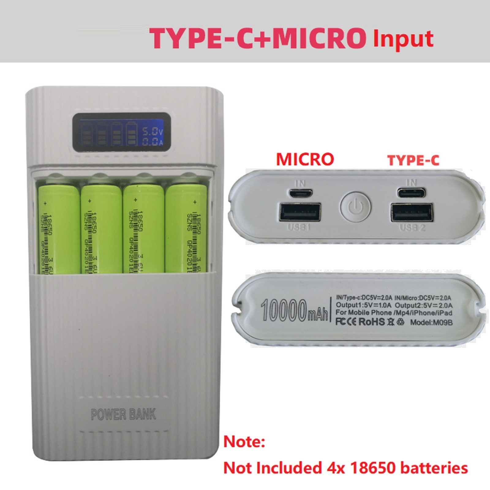 Digital Display 4x18650 DIY Power Bank Case Portable Charger Storage Box White