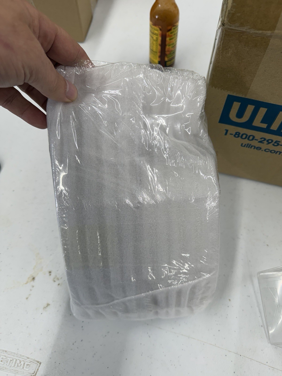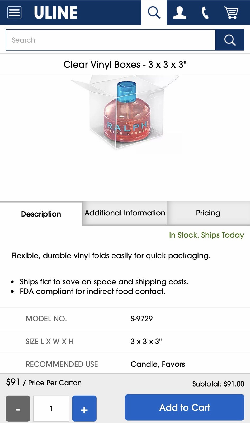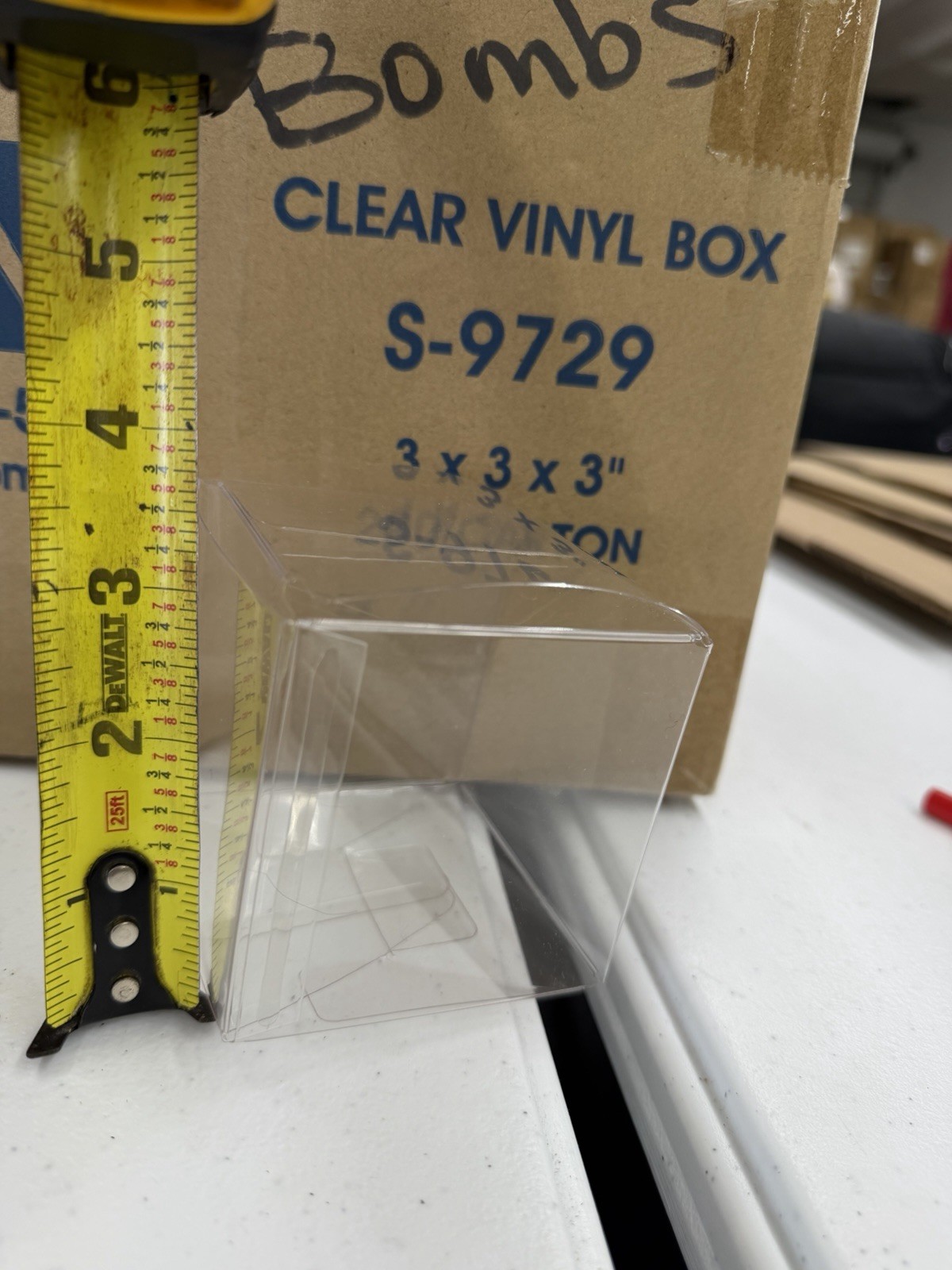 • They assemble into a clear, open-top or tuck-style cube (appears partially folded/assembled in shots, with a slanted or straight side view). These are Uline S-9729 Clear Vinyl Boxes (listed as S-9729 on Uline’s site, note the slight number variation in your photo but it matches exactly: 3 x 3 x 3” clear vinyl boxes).