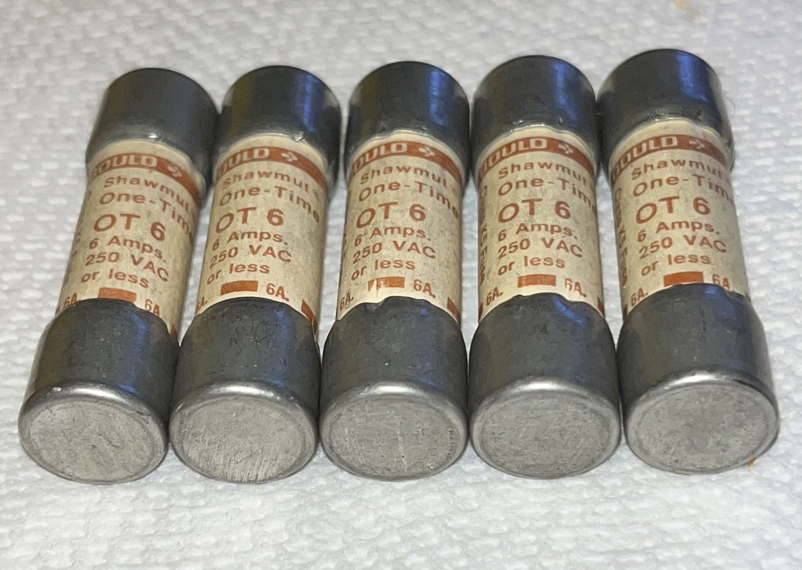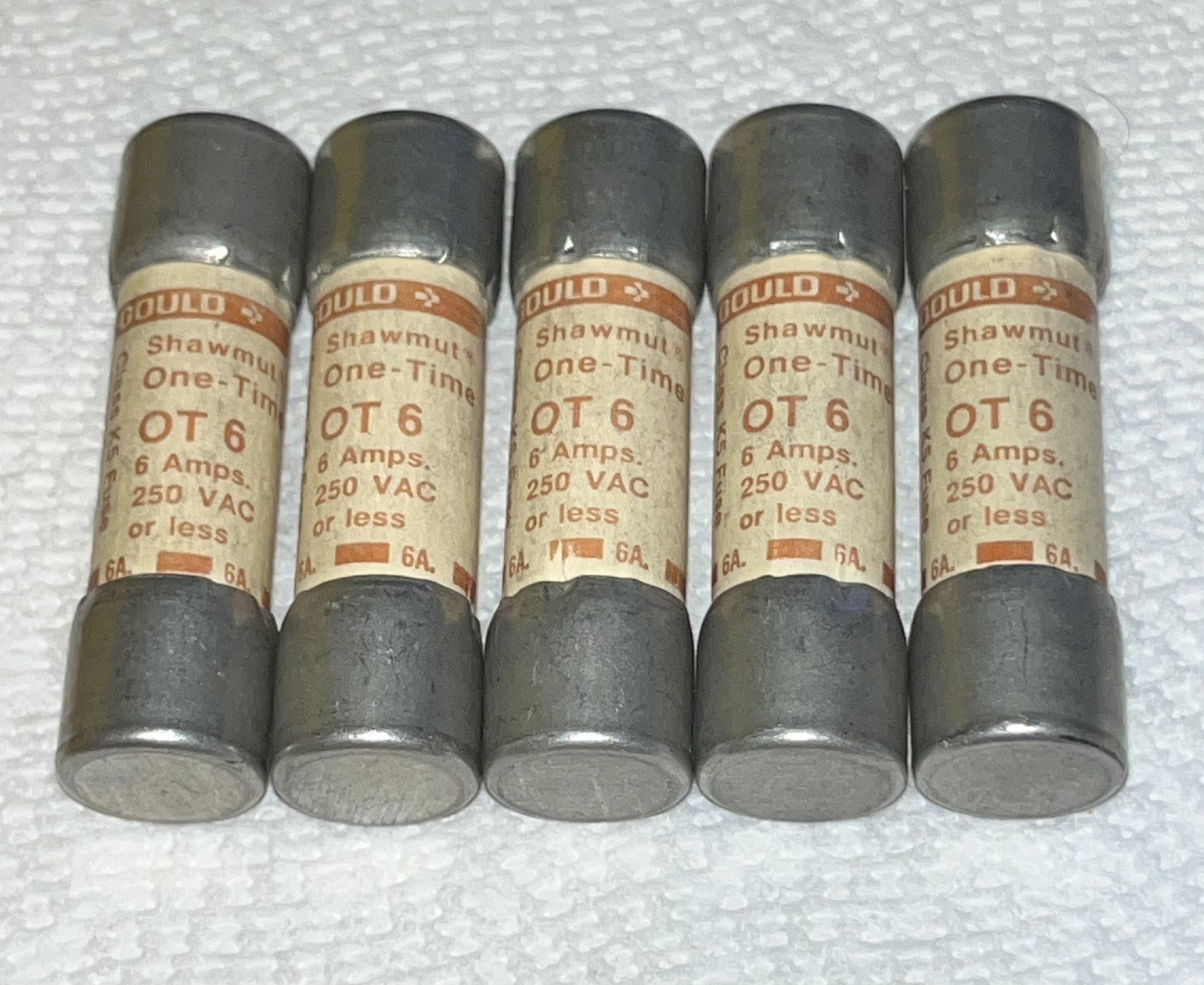 Lot of (5) NEW* (Old Stock) Gould (Ferraz Shawmut) P/N: OT6 One Time Fuse • 6A - 250V AC or Less - IR50kA - Class K5 • NEW* (Old Stock) = 1000% NEW & Unused but no original manufacturers packaging. Fuses ship lose….