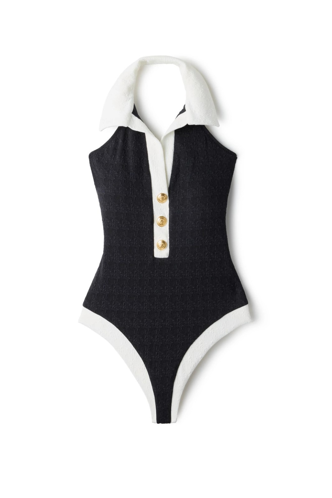 Collared neck. French sophistication in a swimsuit. Shell: 93% nylon/7% elastane; lining 1: 87% nylon/13% elastane; lining 2: 76% nylon/24% elastane. Water safe textured bouclé fabric.