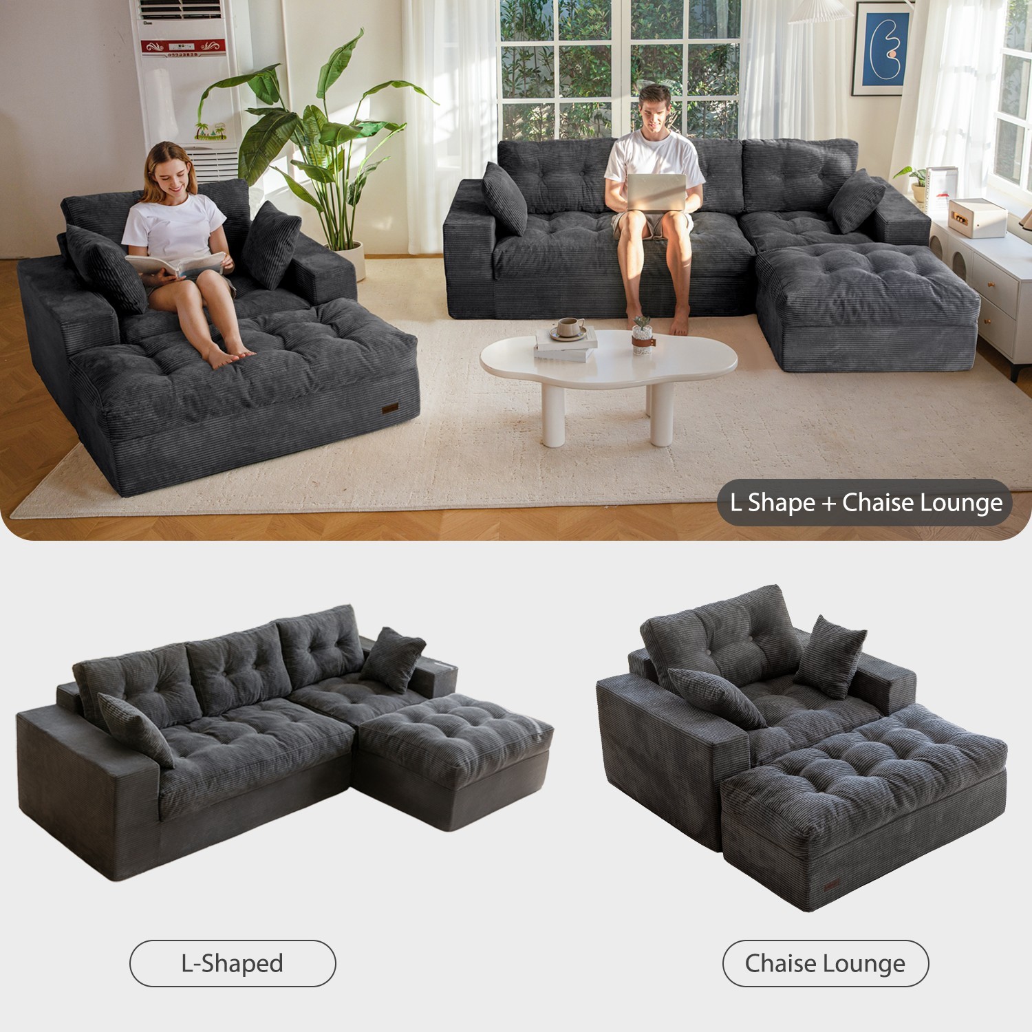 135" Corduroy Couch Sectional Sofa with Chaise L Shape Boneless Cloud Couches