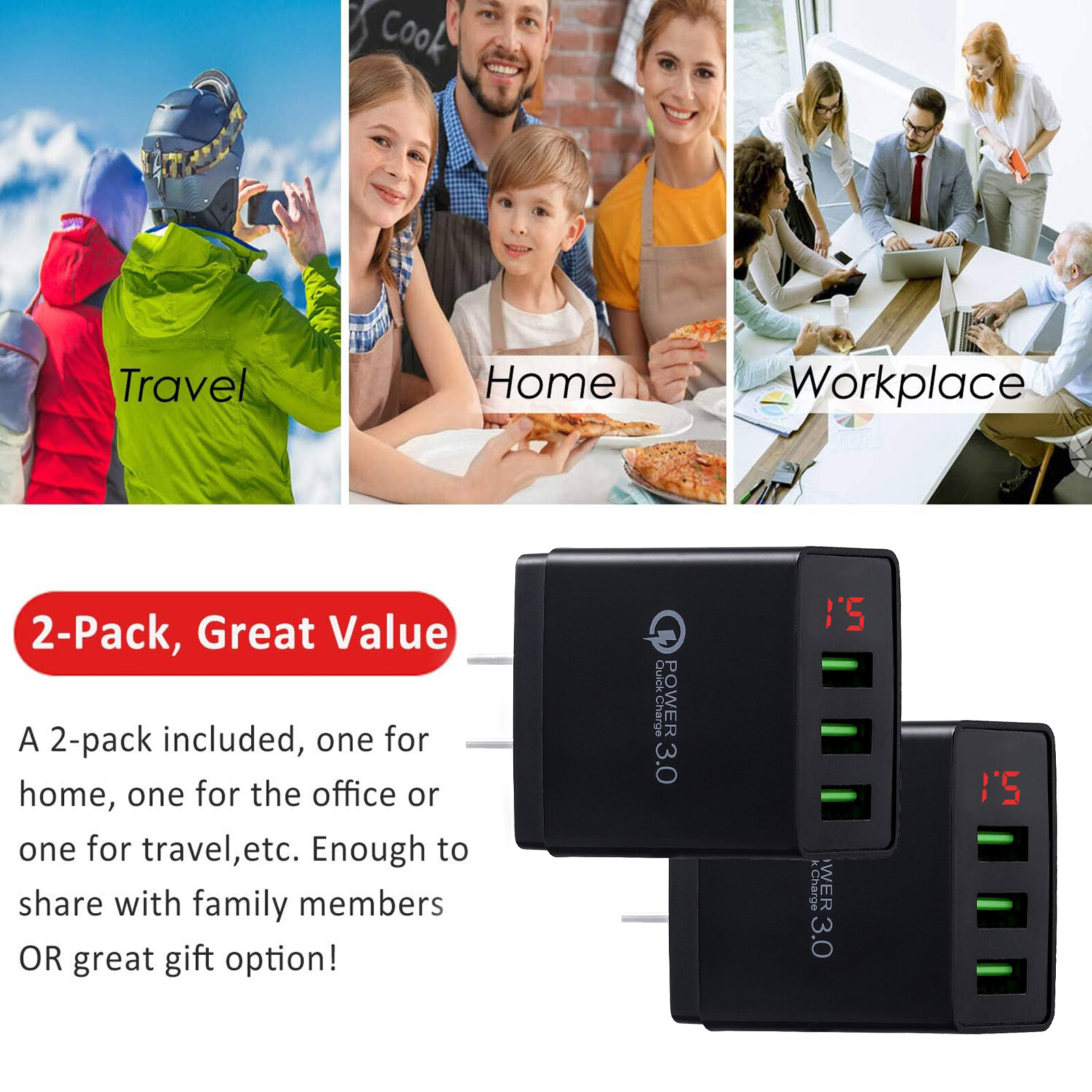 2Pack 3 Port Fast Quick USB Fast Charger w/ Digital Display QC 3.0 US Plug Black