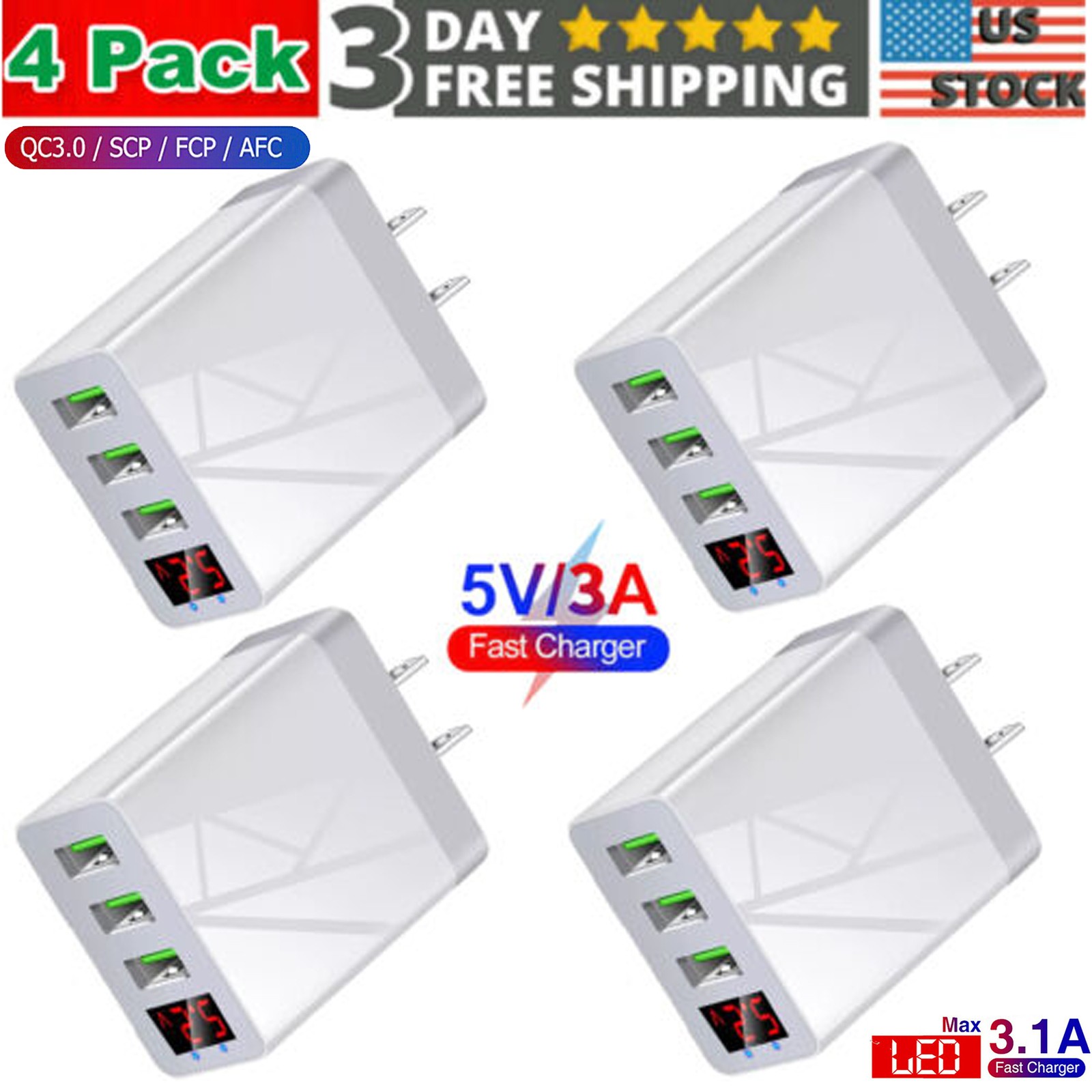 4 PCS 3 Port Wall Charger Fast QC3.0 Quick Charge USB Hub Power Adapter Plug US