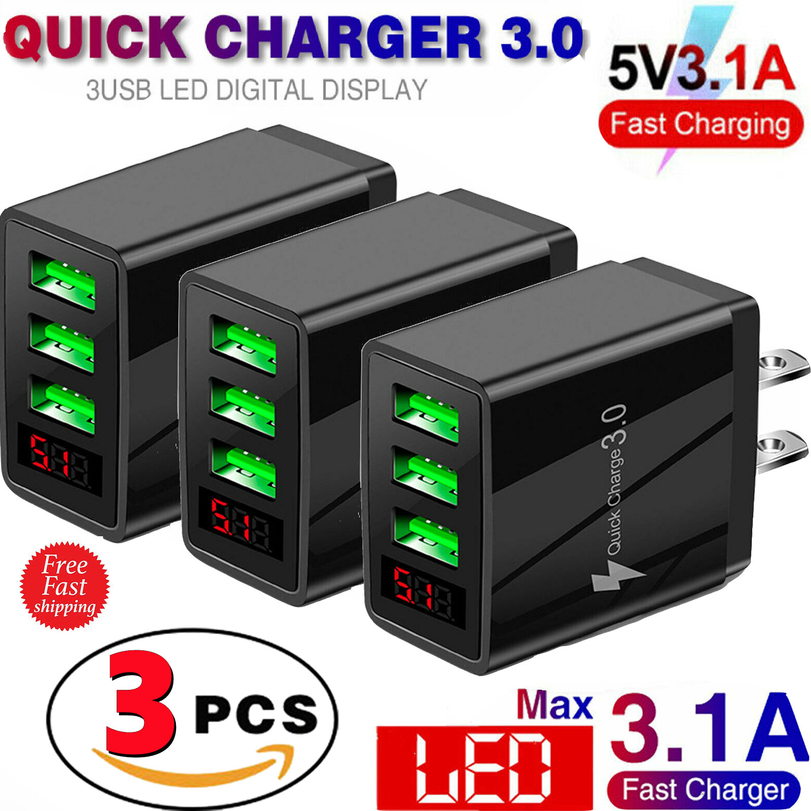 3PCS 3 Port Fast Quick QC 3.0 USB Hub Wall Charger for Cell Phone iPhone Samsung
