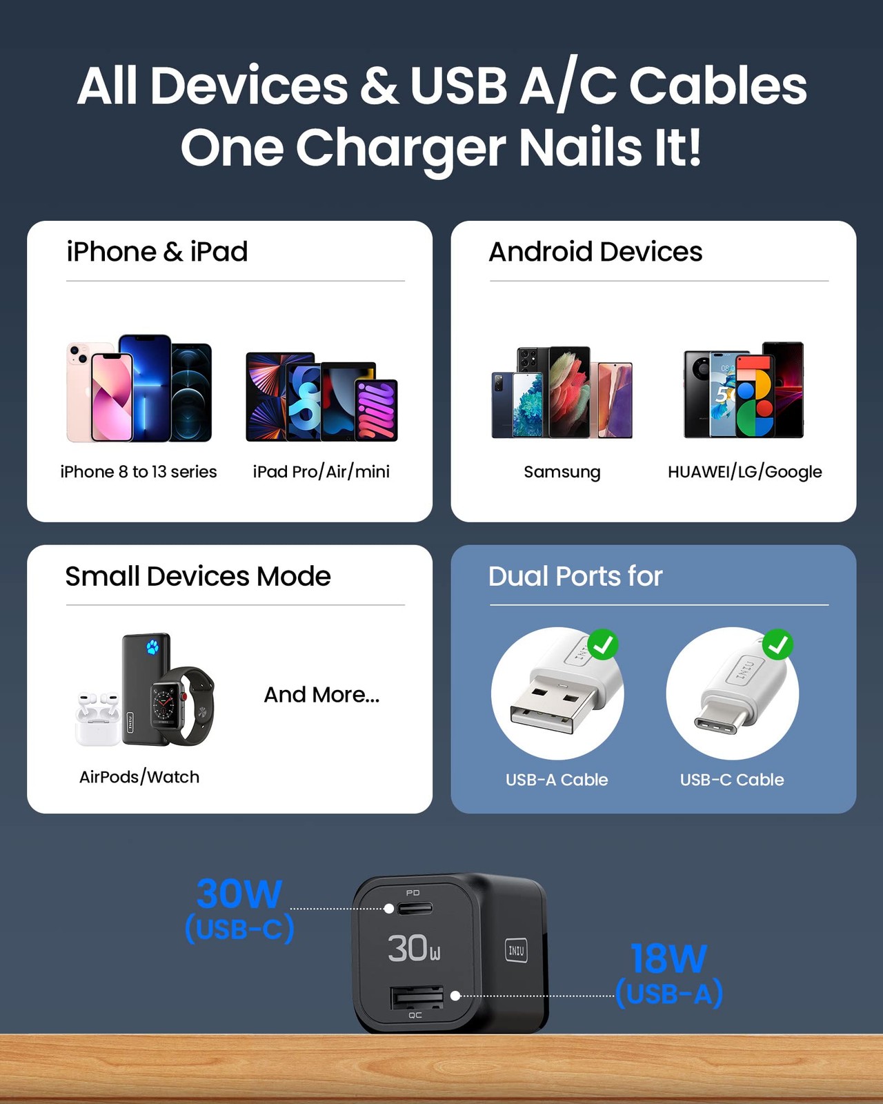 USB C Charger, INIU 30W PD QC 3.0 Dual Port Type C Charger Fast Black