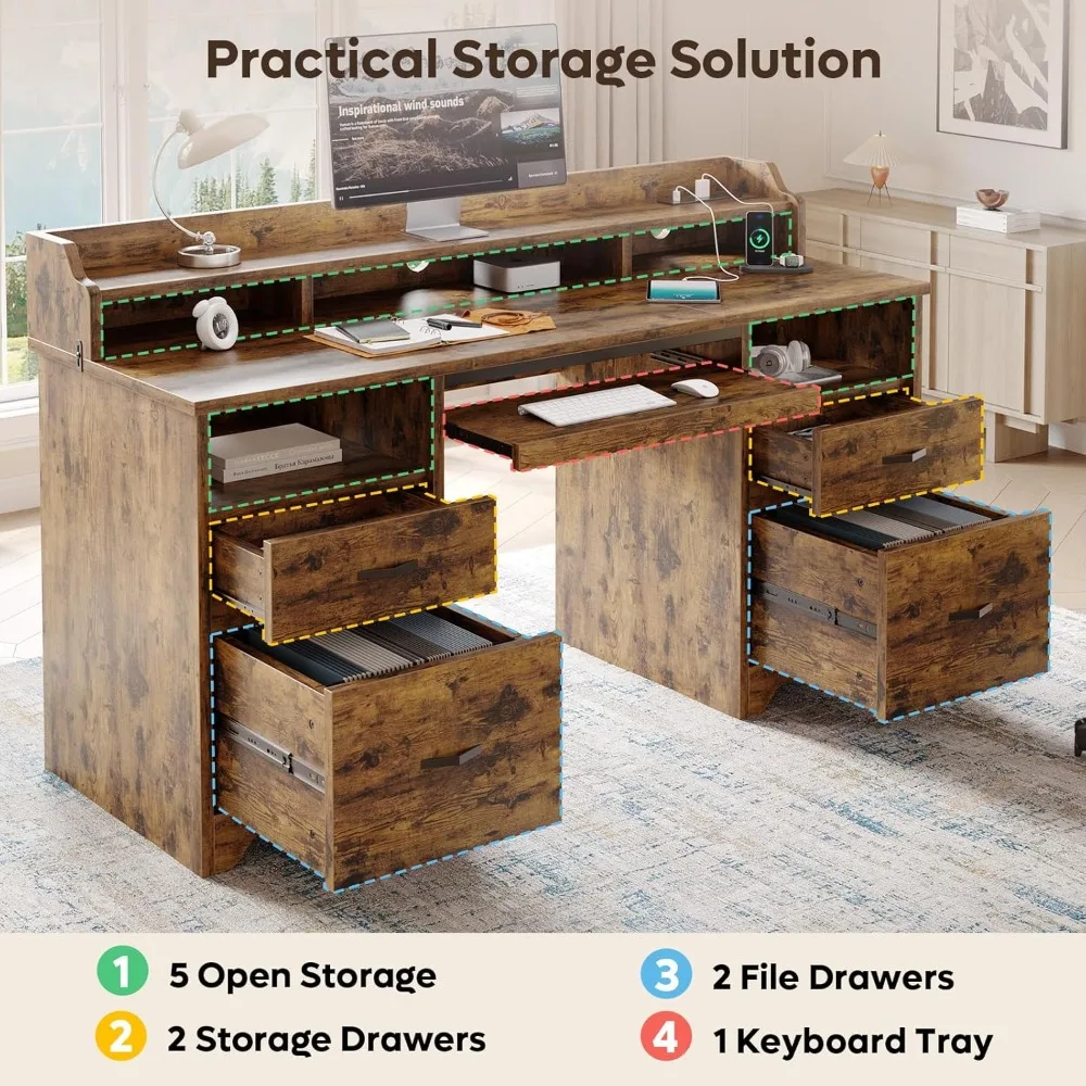 "Executive 59 Inch Farmhouse Desk with Storage Drawers, Wooden Computer Desk featuring a Charging Station, Home Office Desk with